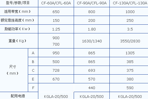 CF、CFl系列悬挂式电磁除铁器,是国内使用最早、亦是目前使用量较多的除铁设备,一直以操作方便,性能稳定可靠,价格合理,维修率低,深得用户的依赖,全封闭的多工作磁极磁路结构,是恶劣工作环境中除铁的常用设备。可与RCDB干式圆盘电磁除铁器通用。该系列产品由于采用计算机辅助设计优化改进了产品结构,其技术参数达到了国外同类产品的先进水平。