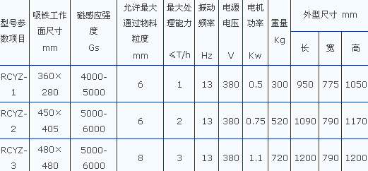 概述: RCYZ系列振动式干粉除铁器,是专门从粉状物料中清除铁粉及铁杂质的一种专用微粉除铁设备。它采用稀土永磁材料提供磁化场 ,在不锈钢箱外产生高梯度强磁场。两块不锈钢刺板作横向相对运动,两块不锈钢板上布满等距的磁感应棒,当物料通过漏斗进入不锈钢刺板箱内,在自重作用下垂直经过磁感应棒,在下落过程中,物料中夹杂的铁磁性物质即被磁棒吸附,当被吸附的铁磁性物质较多时,人工转移磁场清除铁杂质。本机可连续或断续喂料,除铁率达95%以上。广泛应用在陶瓷、电瓷、玻璃、耐火材料及石英砂、化工、塑料、磨料磨具等行业中清除铁杂质。 注:该机标定的物料处理能力是按石灰石计算的。